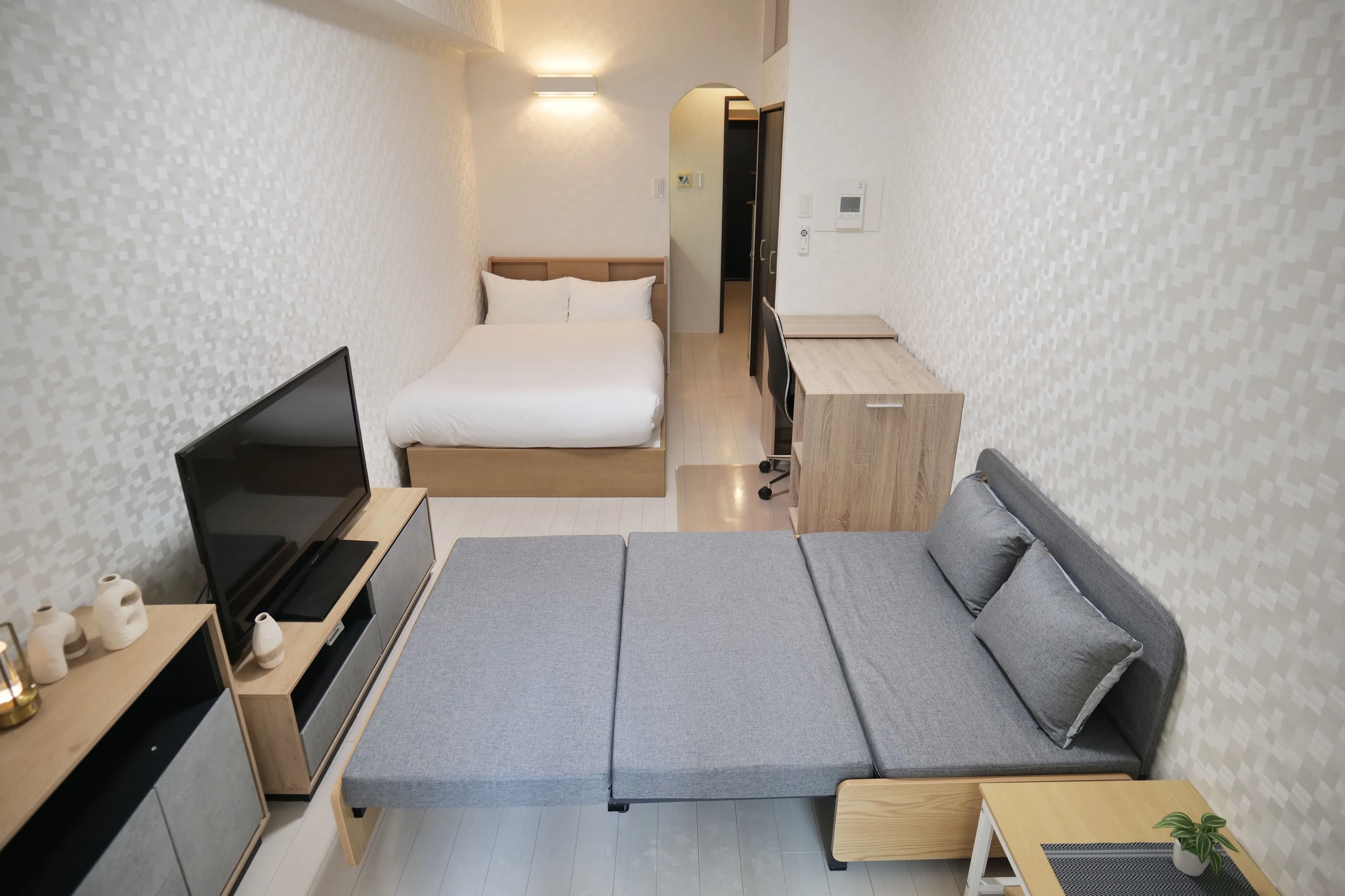 This room is perfect for couples, small families, or a group of friends planning to enjoy a short trip in Tokyo. It features a cozy semi-double bed with underbed storage and a comfortable sofa bed — thoughtfully designed to maximize space and transform easily into two beds at night and a sofa during the day, giving you more room to move around. A large closet with extra top storage allows you to neatly store your luggage, while a foldable desk provides flexible space for working or relaxing. The extendable center table offers just the right length for shared meals or casual gatherings. You can also enjoy a private veranda — perfect for relaxing or drying clothes. Designed with multifunctional furniture, this room captures the essence of modern urban living in the heart of Tokyo.