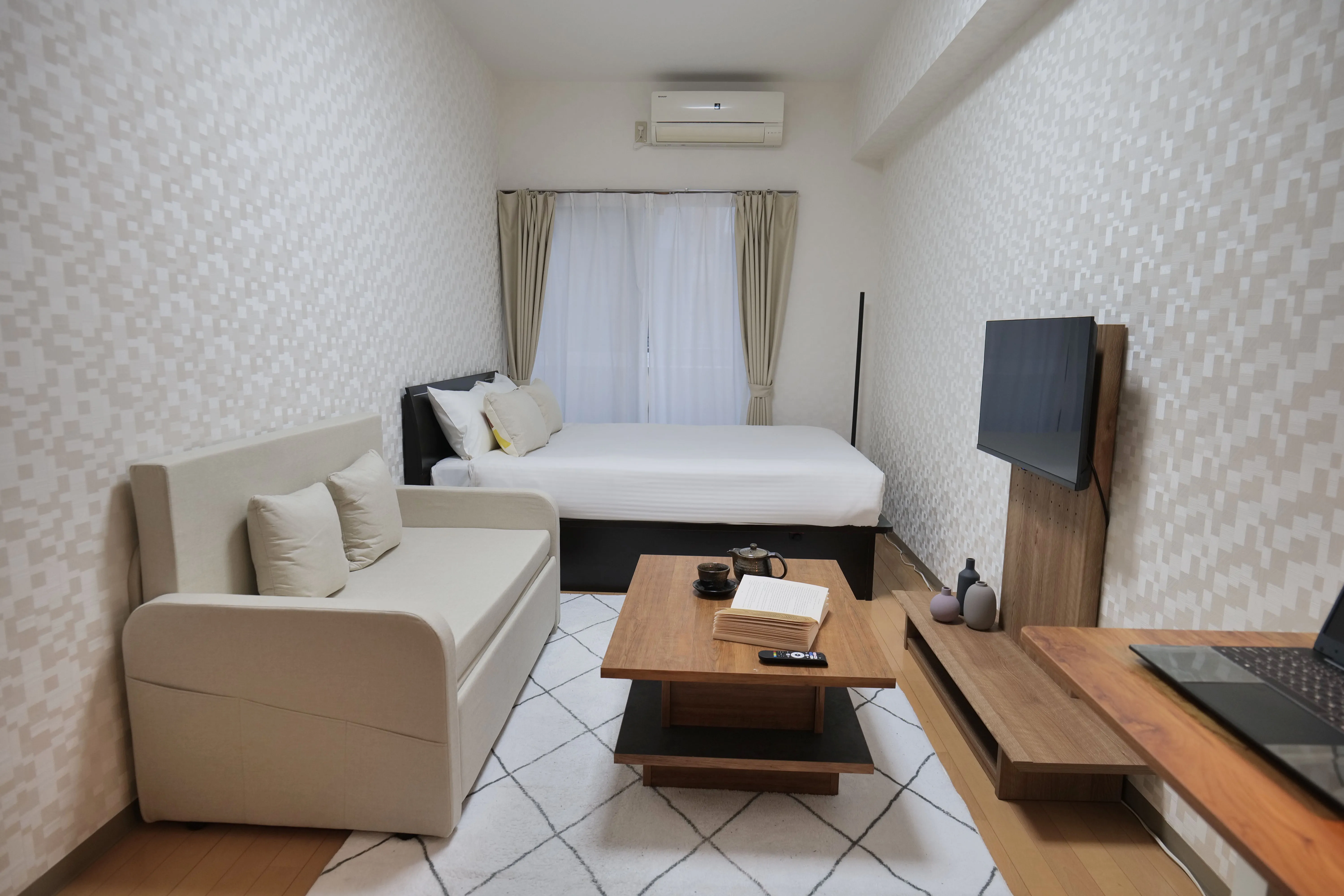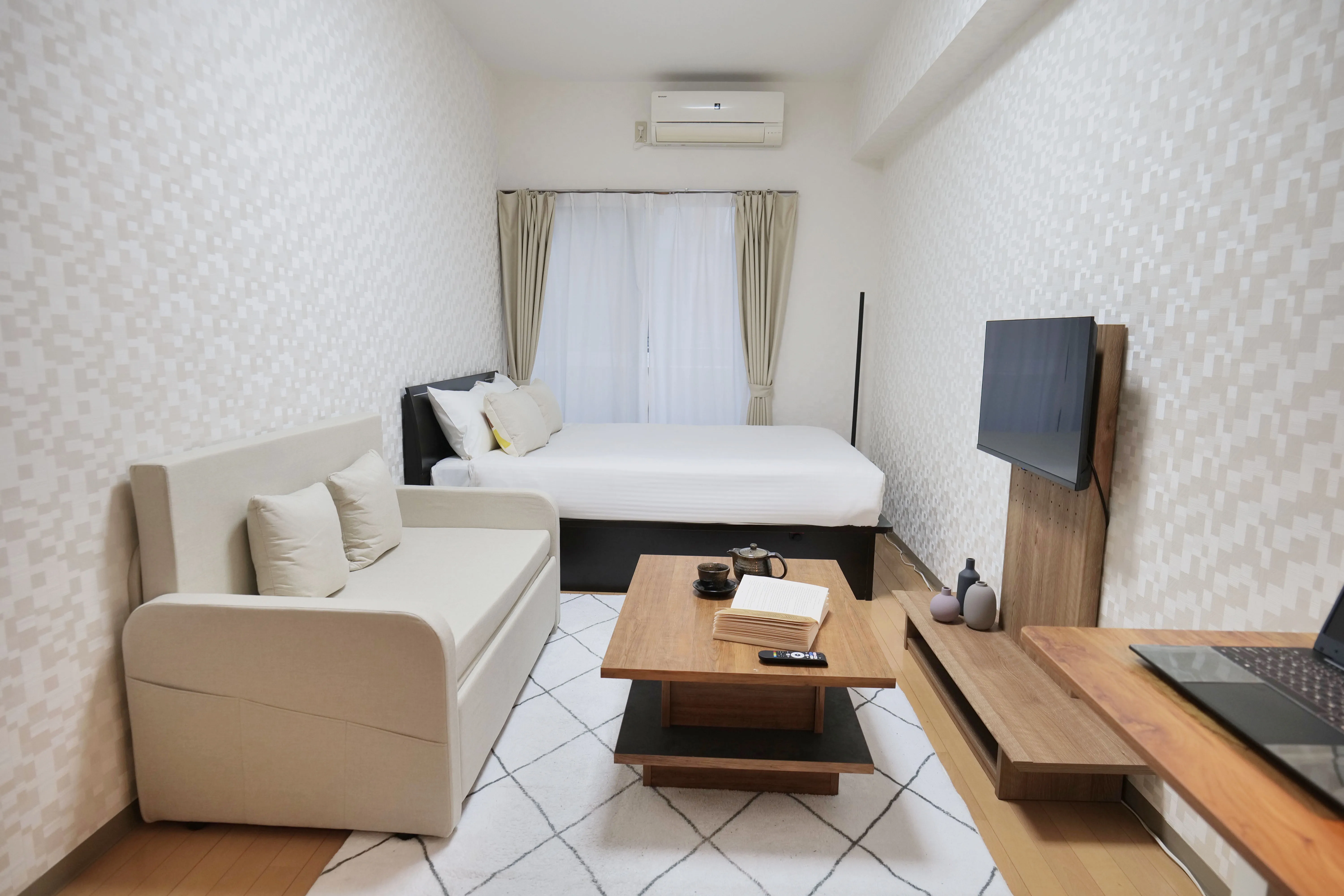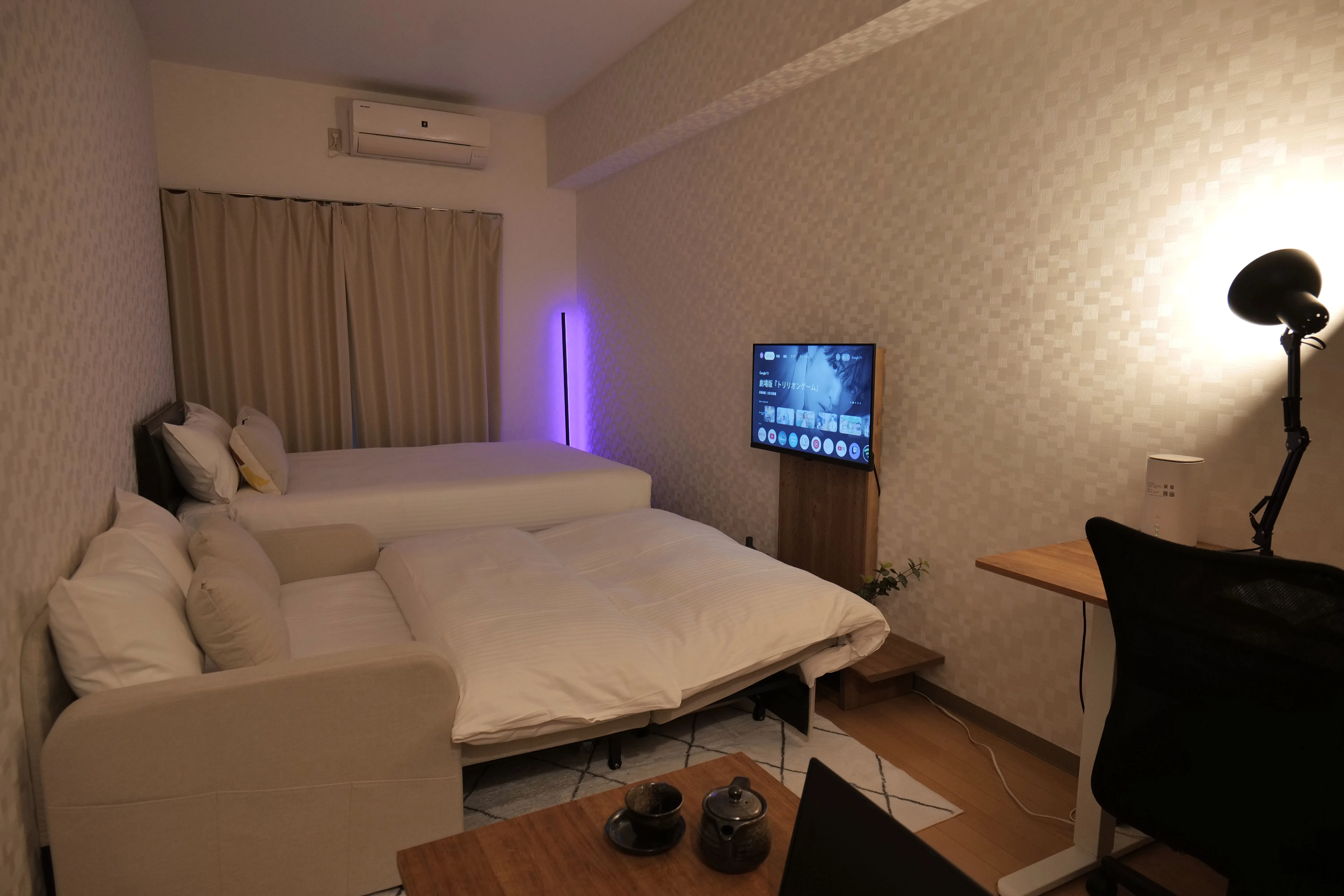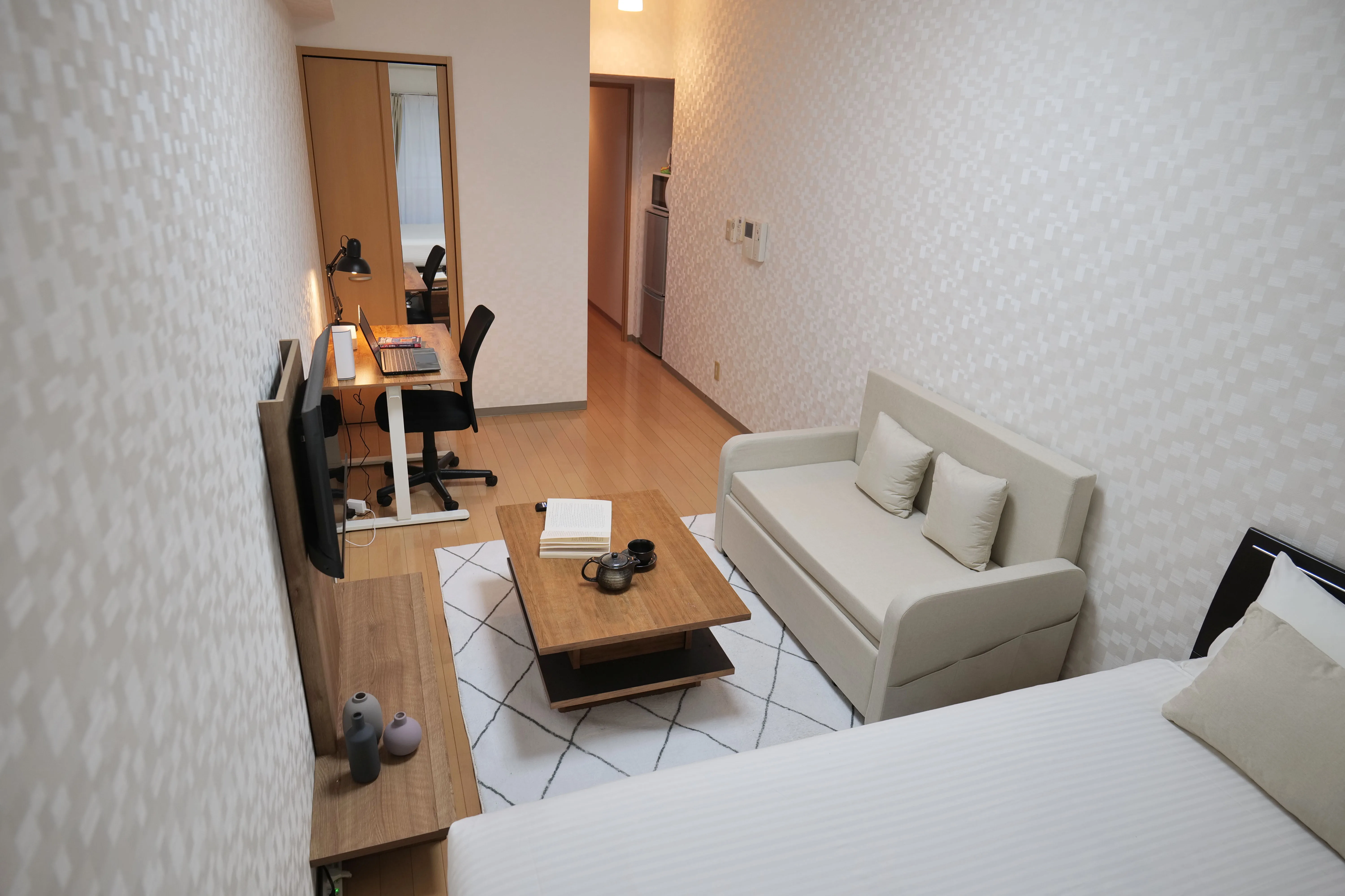 This cozy, thoughtfully designed room is perfect for guests staying in Tokyo for work or study. It features multi-functional furniture ideal for a telework setup — including a hydraulic lift-up center table that transforms into a convenient workspace while you relax on the sofa, and an electric height-adjustable study desk that lets you switch effortlessly between sitting and standing. The main bed also includes a hydraulic lift with spacious underbed storage, allowing you to maximize space without sacrificing comfort. Combining modern style and smart functionality, this room offers everything you need for a productive and relaxing stay in Tokyo.